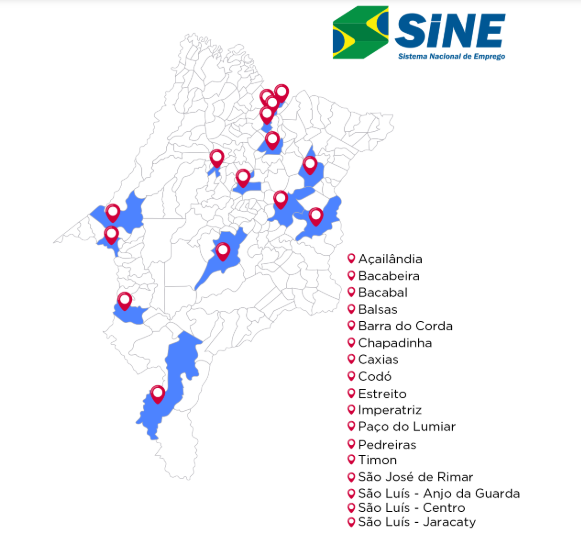 Imagem com fundo braco. Sobre esse fundo há o mapa do Maranhão com destaque em azul e vermelho para as cidades em que há agências do Sine: Açailândia, bacabeira, Bacabal, Balsas, Barra do Corda, Chapadinha, Caxias, Codó, Estreito, Imperatriz, Paço do Lumiar, Pedreiras, Timon, São José de Ribamar (escrito Rimar na imagem) e São Luis (Centro, Anjo da Guarda e Jaracaty). Fim da descrição.