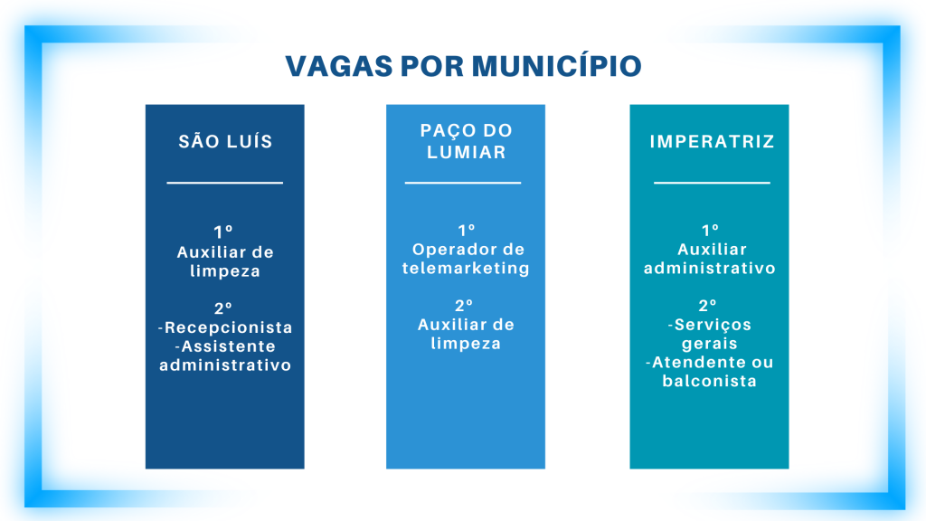 Imagem em tons de azul e branco mostrando que vagas foram mais disponibilizadas para cada município. Em São Luís: auxiliar de limpeza em 1º, enquanto em 2º ficaram recepcionista e assistente administrativo. Em Paço do Lumiar ficaram operador de telemarketing em 1º e auxiliar de limpeza em 2º. Já em Imperatriz, o 1º ficou auxiliar administrativo, enquanto em 2º ficaram serviços gerais e atendente ou balconista. Fim da descrição.