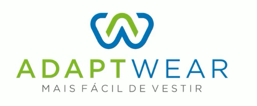 Imagem com fundo branco, sobre ela há o logotipo da empresa que consiste de uma letra W azul com um acento circunflexo verde dentro dele. Abaixo do logotipo tem o nome Adaptwear em verde e azul e o texto cinza “Mais fácil de vestir”.