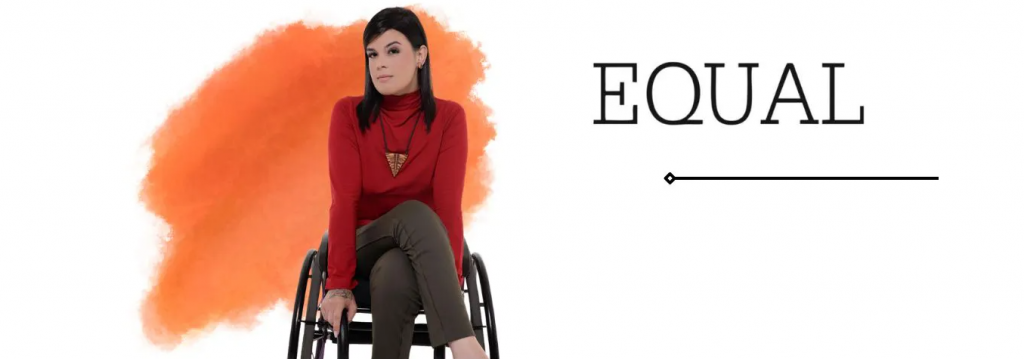 Imagem com fundo branco, sobre ela há a foto de uma mulher em cadeira de rodas com as pernas cruzadas, ela é uma mulher branca, de cabelo liso preto e veste uma camisa vermelha, colar com pingente triangular e calça cinza. Ao lado dessa mulher tem o nome Equal com uma linha preta embaixo e atrás dessa mulher tem uma mancha laranja.