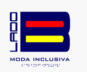 Imagem com fundo branco, sobre ela há um grande B em azul escuro, o círculo de cima esté preenchido de vermelho e o de baixo de amarelo. À direita do B está a palavra “Lado” na vertical e abaixo está escrito “Moda inclusiva”. Abaixo de tudo isso tem uma inscrição em braile não identificada.